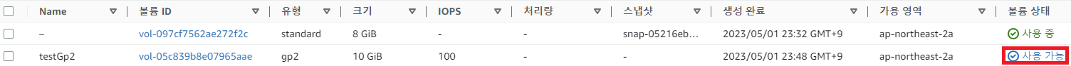 그러면 아래와 같이 상태가 "사용 중"이던 볼륨이 "사용 가능"으로 나타난다.