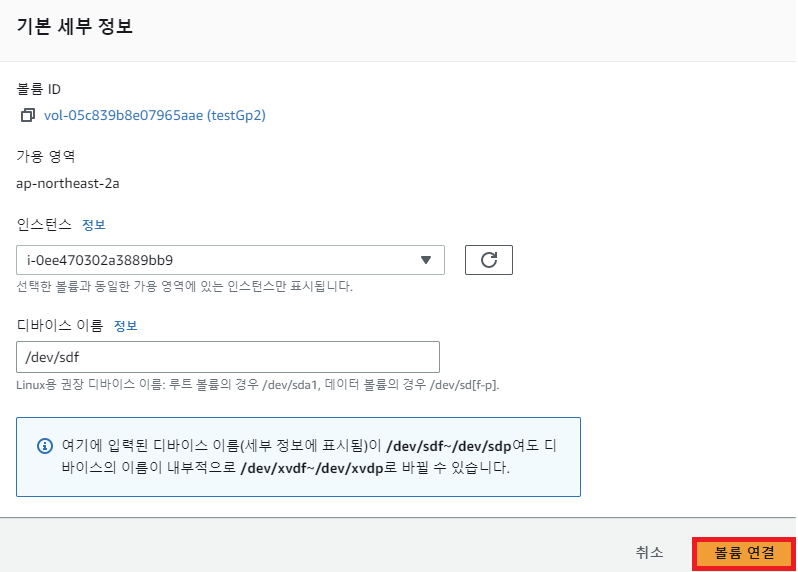 그러면 인스턴스와 디바이스를 설정할 수 있다. 이때 인스턴스에 연결하고자 하는 EC2 인스턴스를 선택하면 디바이스는 자동으로 설정된다. 잘 설정했으면 "볼륨 연결"을 클릭한다.