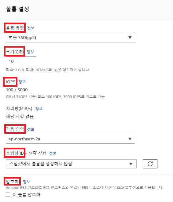 - IOPS: 범용 SSD로 설정하면 IOPS는 설정할 수 없다. 만약 gp2가 아닌 프로비저닝된 다른 타입을 사용하면 IOPS를 선택할 수 있다.